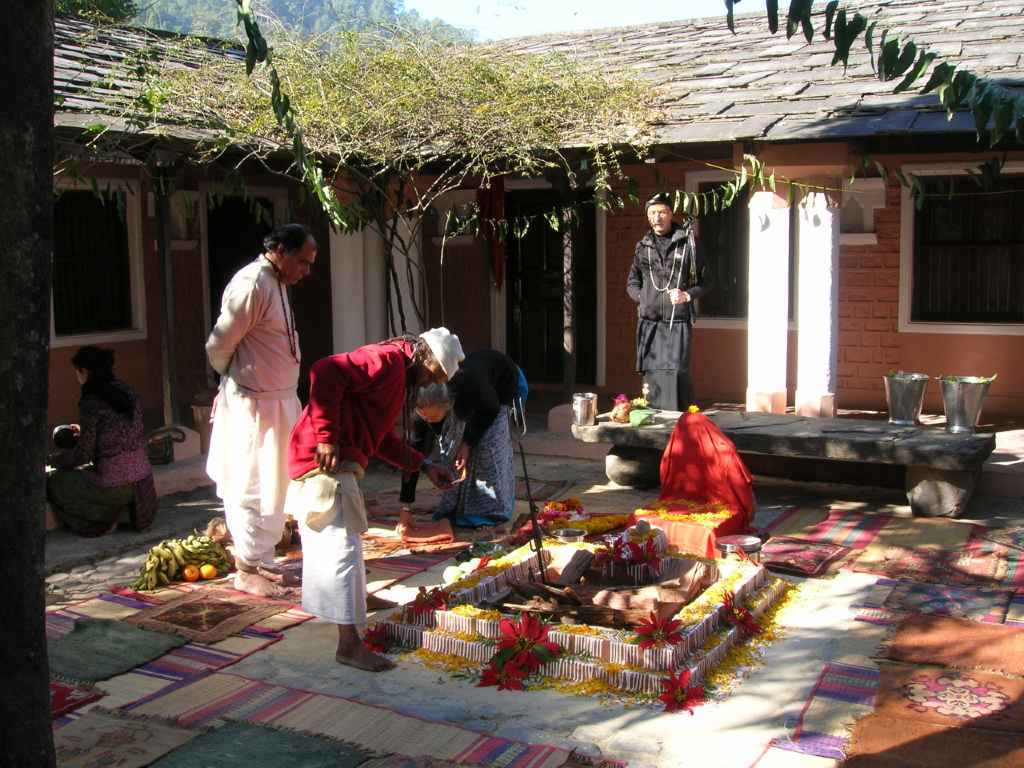 Prima di partire alla volta di Herakan ci siamo fermati ad Haldwani a fare provviste: abbiamo acquistato piatti (i tipici piatti di metallo indiani); bicchieri, posate, materassi (che erano talmente sottili che io pensavo fossero coperte!), e poi siamo andati a presentarci a Muniraji, il Maestro di Herakan, discepolo diretto di Babaji. La sua presenza e il suo spirito elevato ci hanno profondamente intimidito. Insieme, abbiamo partecipato all’Aarati, rituale induista, con l’offerta del fuoco che avviene con una lampada di canfora in onore di una divinità. Al termine della cerimonia, chi per la prima volta si recava all’Ashram riceveva il suo nome spirituale in sanscrito, scelto da Muniraji, nome collegato alle qualità profonde dell’anima della persona, in modo da poterle sviluppare nella pratica e nella vita.